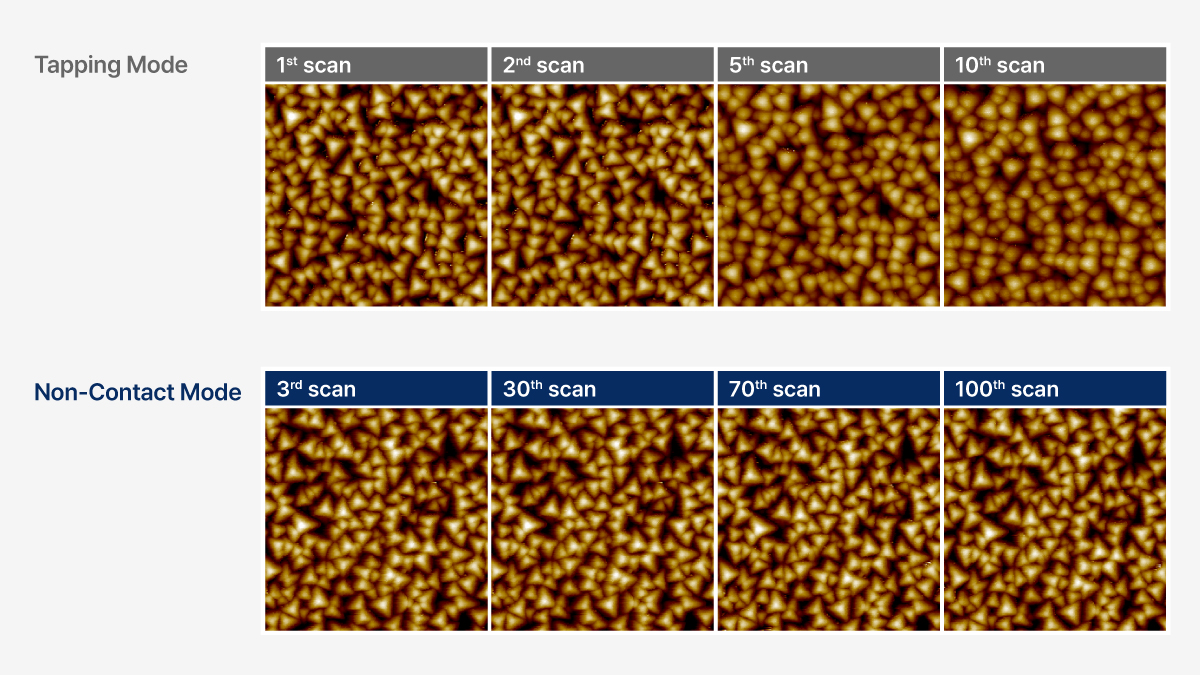 A major advantage of True Non-Contact™ Mode, compared to tapping mode, is the prevention of tip wear and sample damage. The results of repetitive scans on a chromium nitride (CrN) tip-checking sample shows that while the tapping mode image became blurry after just a few scans due to tip wear, the True Non-contact mode image remained sharp even after 100 scans.