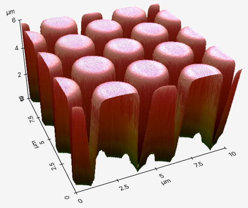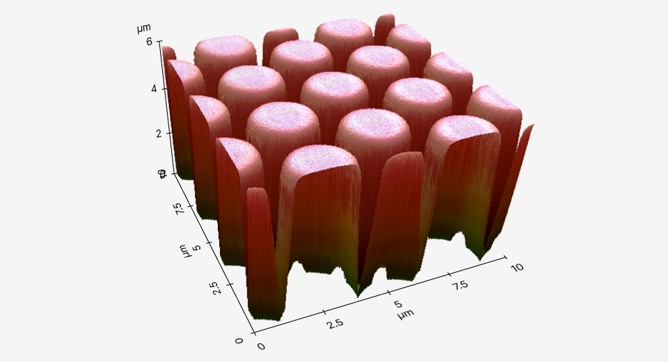 True Non-Contact™ Mode can also image tall features. Sensing attractive forces not only at the tip apex but also along its sides, as the tip approaches vertical features, the Z-servo can quickly retract the tip to climb over the wall.