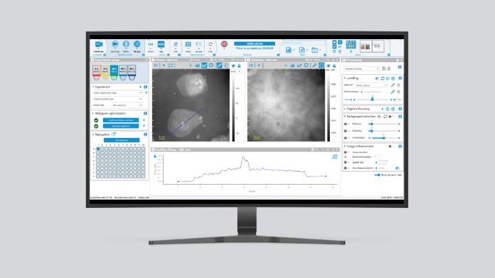 This quasi-instantaneous measurement specificity enables DHM to measure not only the 3D topography of samples, but also to monitor the time response of samples to external stimuli, characterize samples and optimize processes during manufacturing, characterize very large surfaces and screen them for small defects, and operate in situ at high or low temperatures, in liquid, under vacuum, or in a gas-controlled environment.