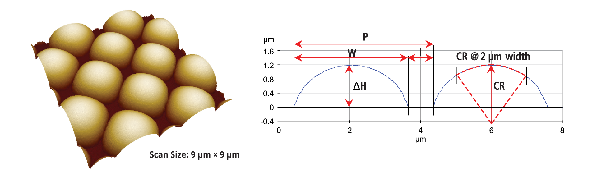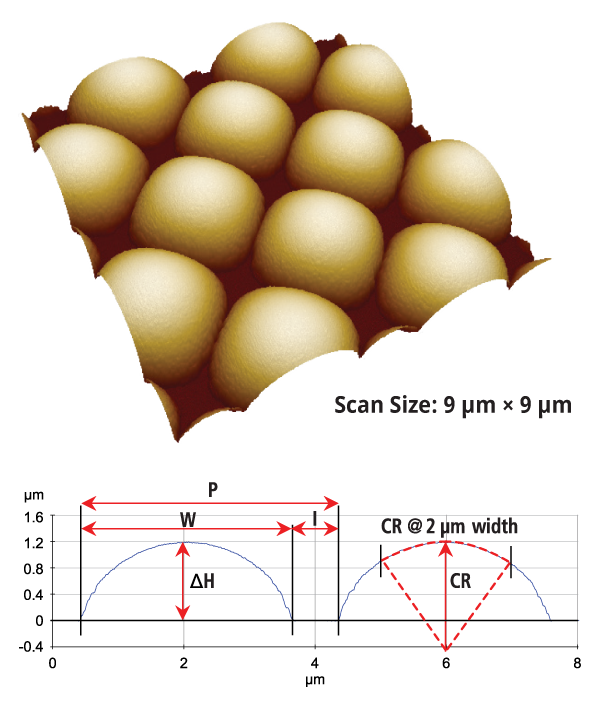 Park AFM accurately measures challenging patterns such as micro-lenses that are difficult to characterize with optical metrology tools, while providing comprehensive analytical capabilities including measurements of width, interval, pitch, height, and radius of curvature.