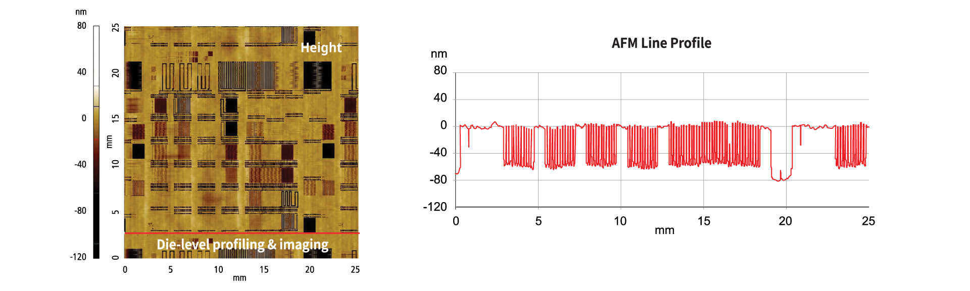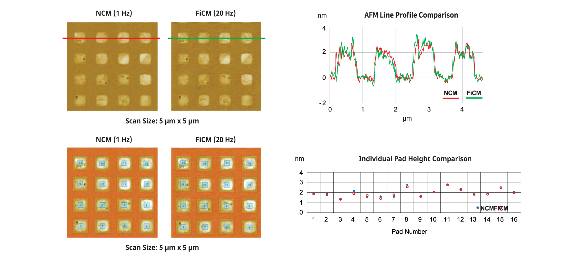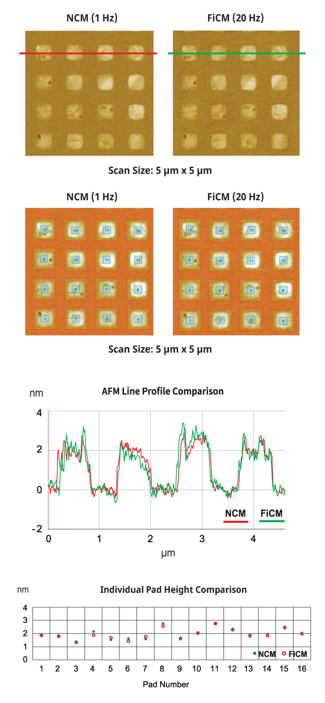 Park’s fast imaging contact mode (FiCM) provides reliable data for Cu pad measurements with high throughput. The Cu pad data from the fast imaging mode deliver line profiles and height values equivalent to those obtained in True Non-contact™ mode. The proprietary analysis algorithm can analyze each Cu pads regardless of pad shape or array arrangement.
