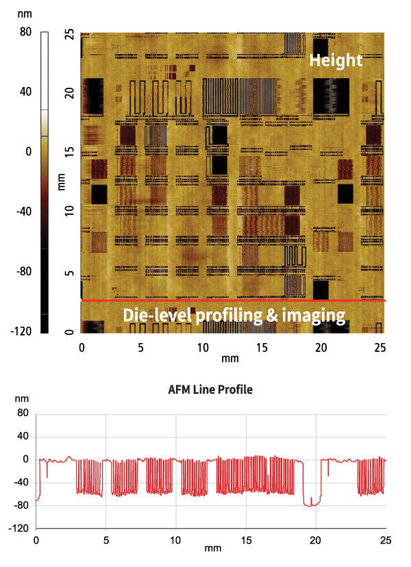 Combining NX-Wafer with a sliding stage provides a long range profiling capability for CMP metrology. Due to the unique sliding stage design of Park’s automated AFM, the combined system provides very flat profiling and enables unprecedented CMP metrology of both local and global planarity measurements including dishing, erosion, and edge-over-erosion (EOE).
