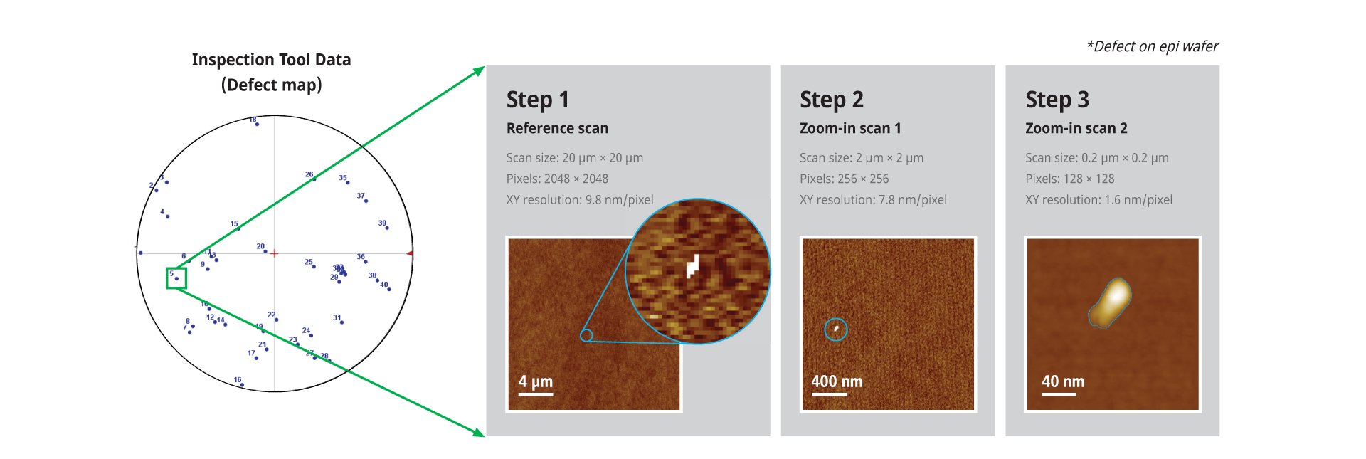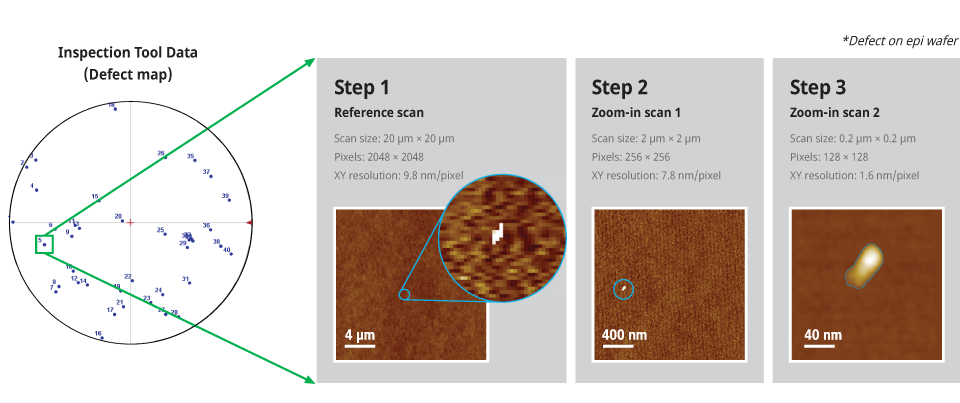 The ADR function provides further analysis of defects detected by conventional defect inspection tools. The defects are automatically scanned by AFM once the inspection tool data with defect coordinates is uploaded. Defect types and profiles are automatically analyzed in detail using zoom-in scan data.