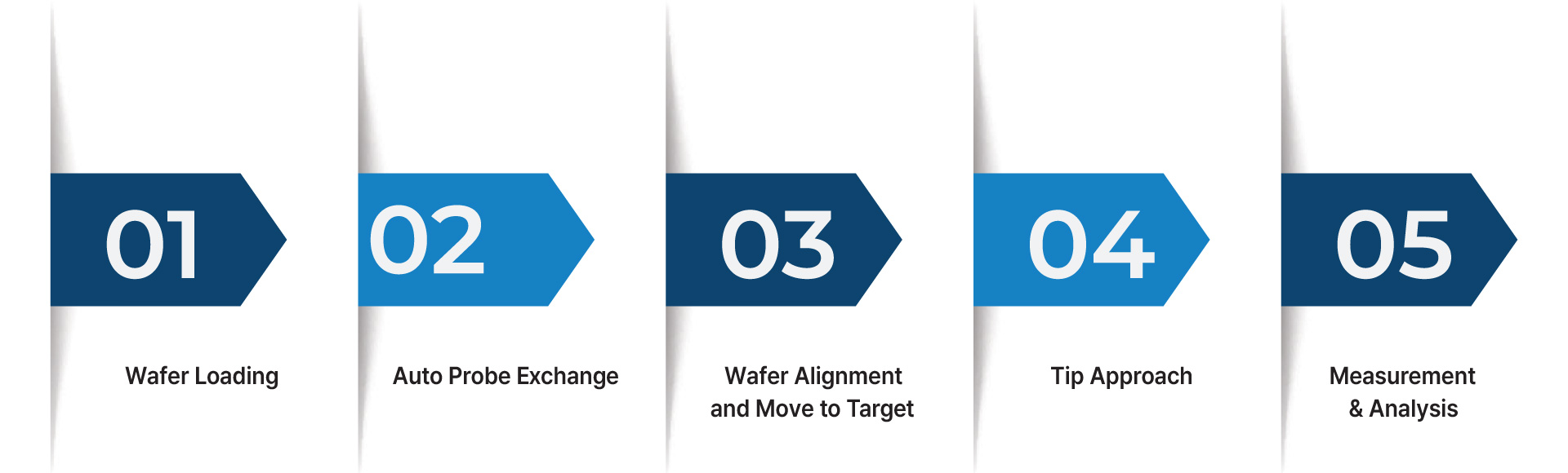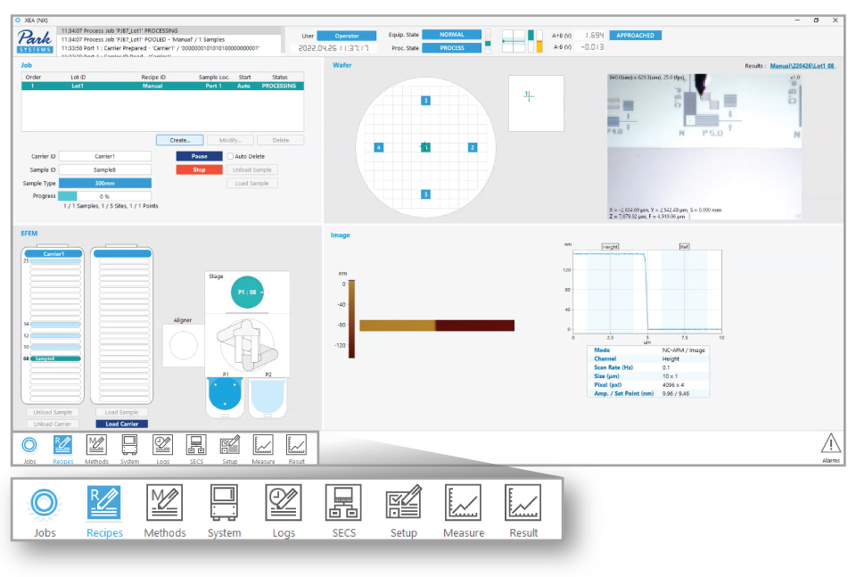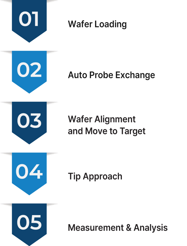NX-Wafer enables fully automated operation from wafer handling to measurement and analysis. It automatically receives a recipe from the host, performs end-to-end automation by selecting the appropriate tip, scanning multiple target areas, analyzing the data, and generating reports.