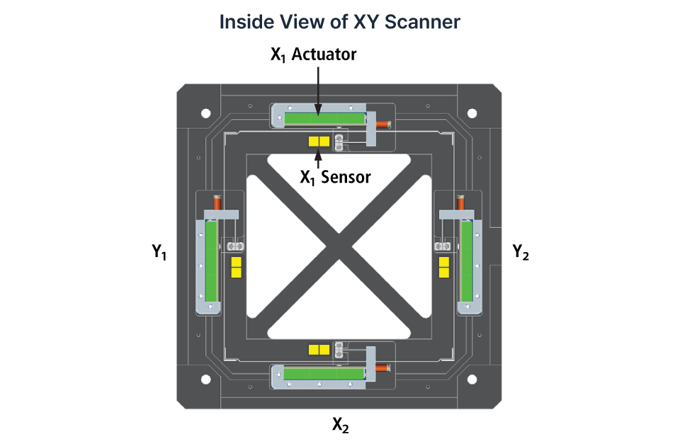 The XY scanner features a dual-servo architecture with two pairs of actuators and position sensors mounted on opposite sides of each axis, providing