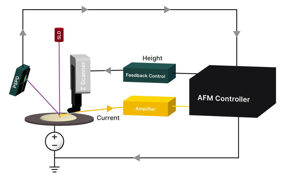 Mapping surface topography and local electrical conductivity via current flow through the conductive AFM tip in contact with the sample