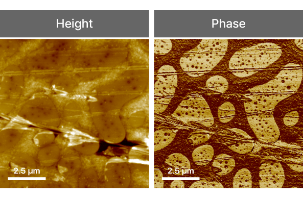 Tapping mode is ideal for studying complex polymer systems, such as blended polystyrene and polyvinyl acetate (PS-PVAc) films. As shown in the images, phase imaging in Tapping mode distinctly reveals nanoscale domain morphology and phase separation in the polymer blend, which is not apparent in the topography data. This enables precise identification of individual polymer components, mapping their distribution and mechanical property contrast, thus supporting advanced research in polymer physics, material engineering, and nanocomposite optimization.