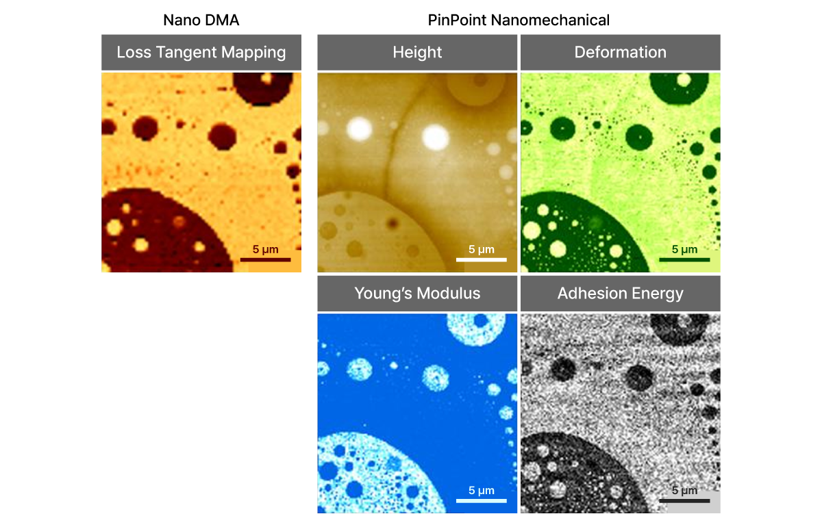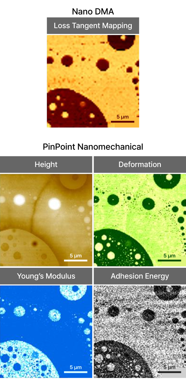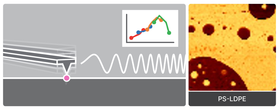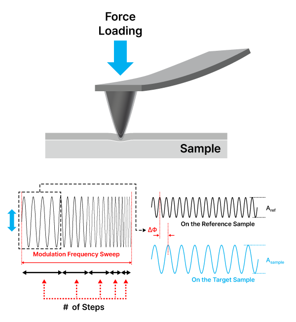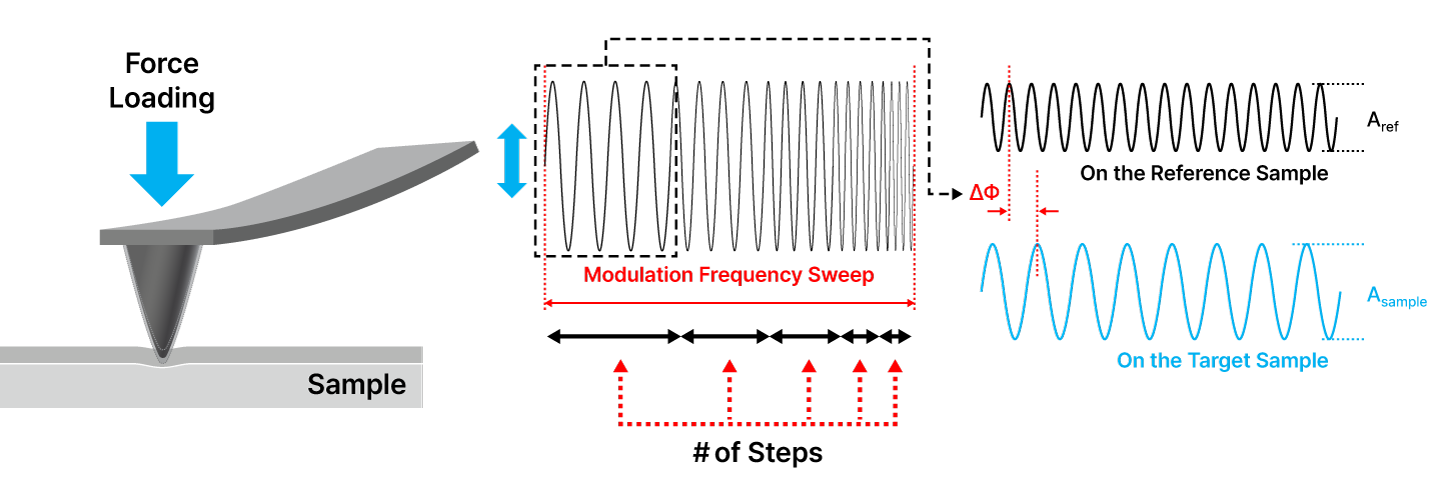 Unlike conventional bulk DMA, which provides averaged values over large sample volumes, AFM-based DMA uses an AFM tip to apply a controlled oscillatory force directly to specific regions, enabling localized mechanical mapping. A sharp AFM tip is brought into contact with the sample surface and oscillated at a series of frequencies. The frequency-dependent response of the material is recorded by monitoring cantilever deflection and phase lag. These parameters allow for the direct calculation of local loss tangent (tan δ), a key parameter describing viscoelastic behavior.
