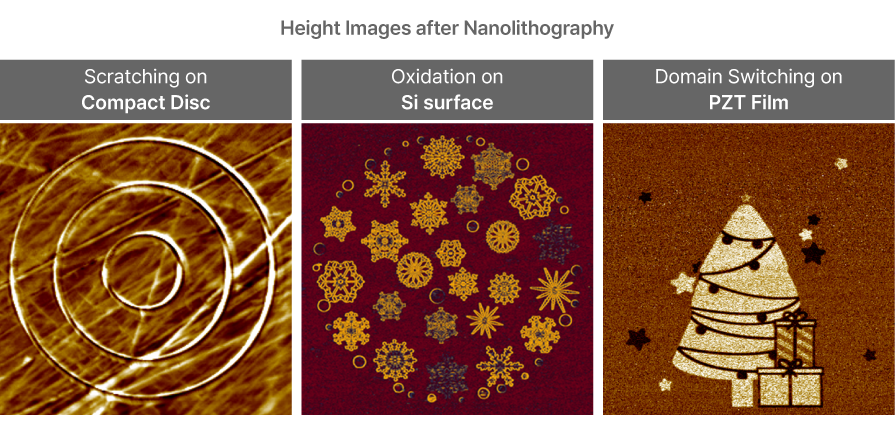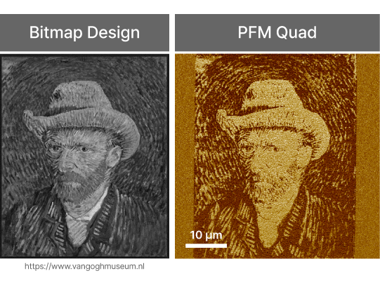 The images indicates AFM nanolithography applied to create a Vincent van Gogh image on a PZT surface by reorganizing ferroelectric domain orientation via tip bias. Using a bitmap design and controlled voltage, localized domain writing was achieved with nanometer precision, highlighting the technique’s capability to fabricate complex functional patterns for data storage, sensors, and advanced materials engineering.