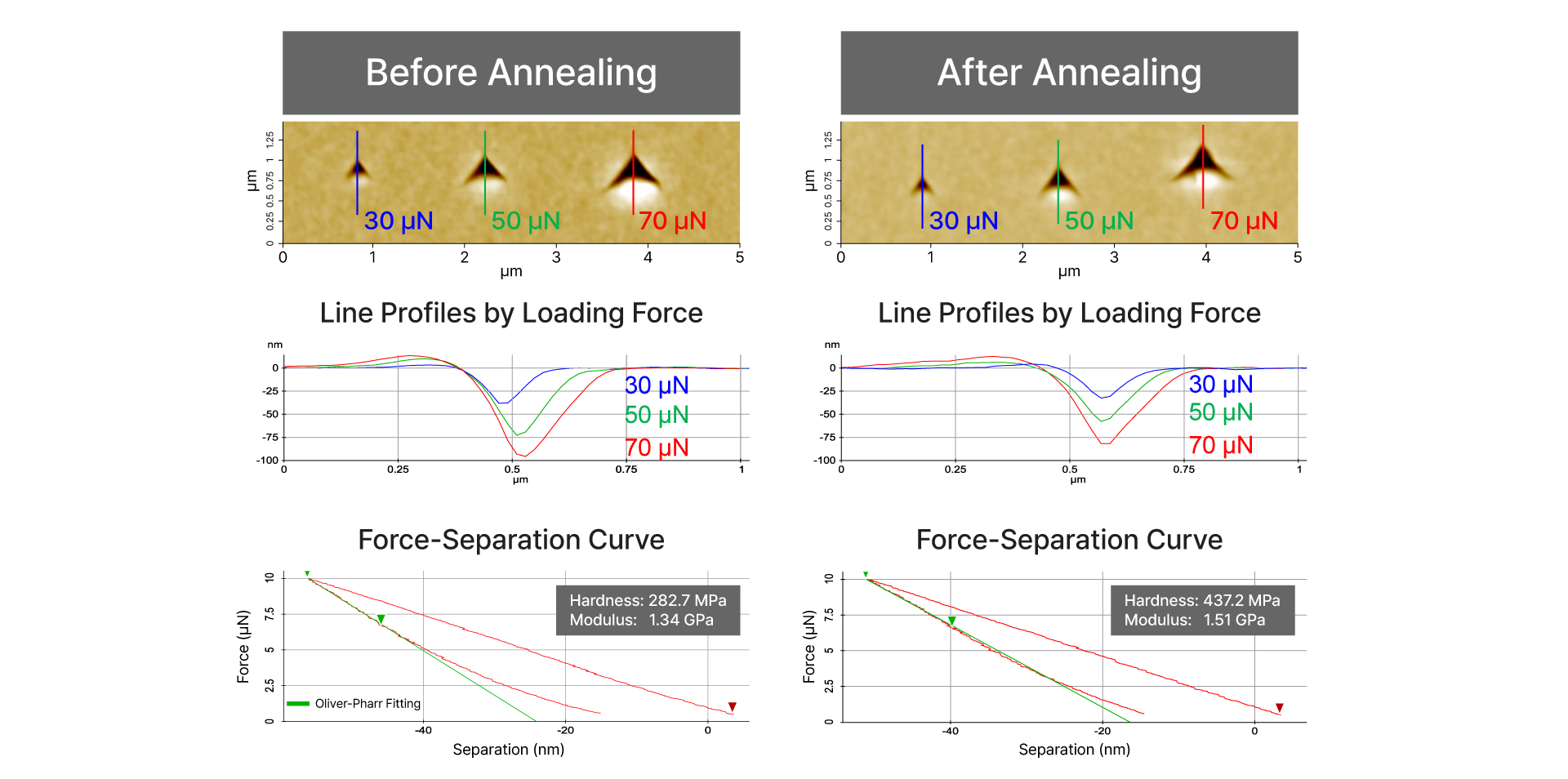 Results illustrate Nanoindentation to study the mechanical properties of carbon-doped hydrogenated silicon oxide (SiOCH) films before and after annealing. Surface profiles and force-separation curves were obtained at various loading forces, allowing precise quantification of hardness and elastic modulus. The results reveal that annealing increases both hardness and modulus, demonstrating the sensitivity and effectiveness of nanoindentation for detecting subtle mechanical changes in thin-film materials.