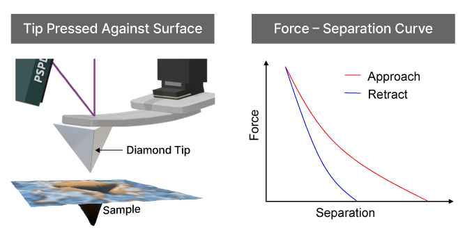 A stiff AFM cantilever equipped with a diamond tip contacts the sample in a controlled manner while the applied force and resulting indentation depth are recorded. This process generates a force–separation curve from which Young’s modulus and hardness (The resistance to permanent deformation) can be calculated, most commonly using the Oliver–Pharr model.